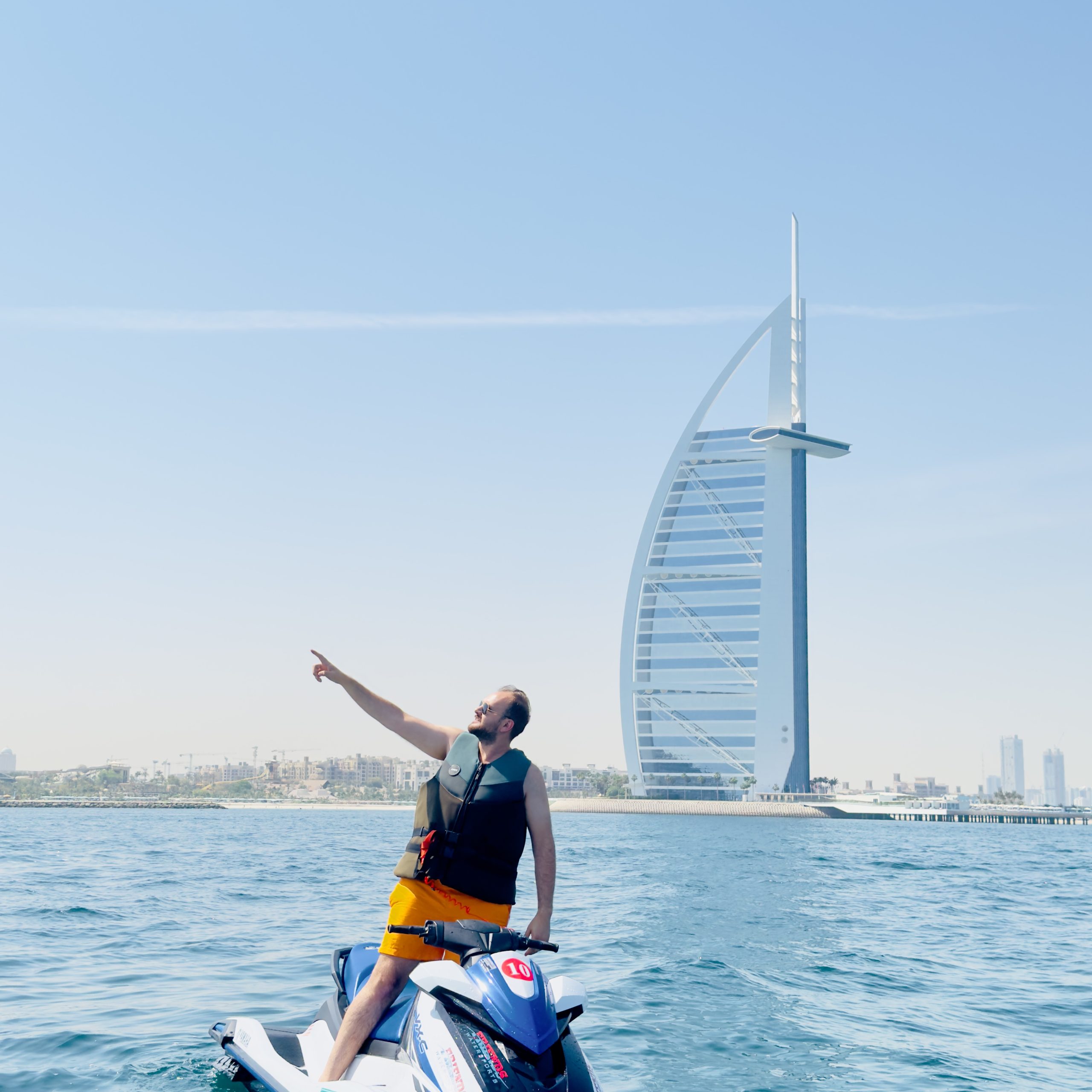 Bu aktivitede 1 Jetski üzerine 2 kişi binebilir, eğitmen öncülüğünde güvenli bir rota izlenir ve tur sırasında Burj Al Arab önünde profesyonel fotoğraf & video çekimi yapılır.